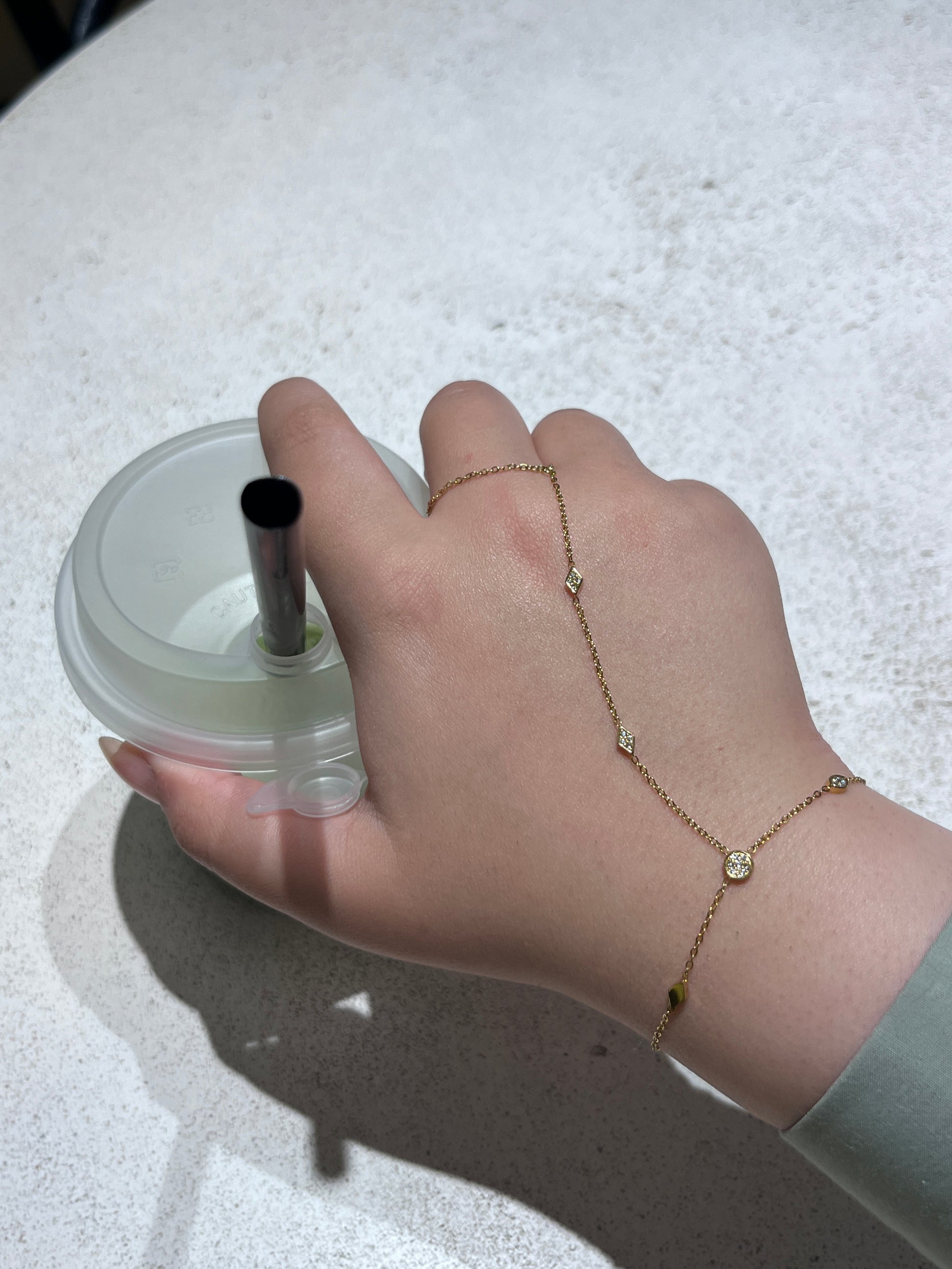 سوار أنيق بتصميم Hand Chain يزين اليد بخطوط رفيعة من الذهب المطلي مع فصوص لامعة بأشكال هندسية راقية.