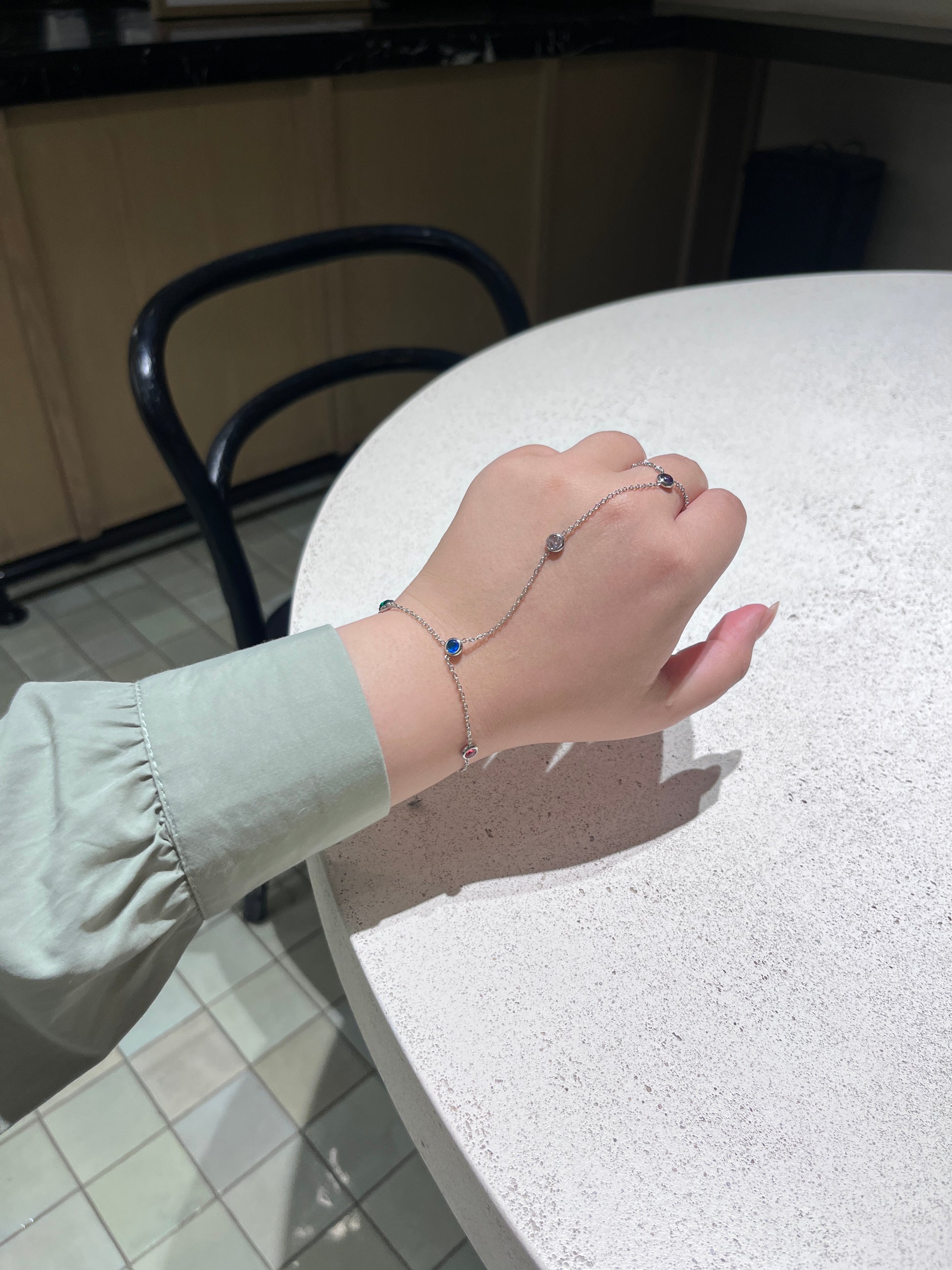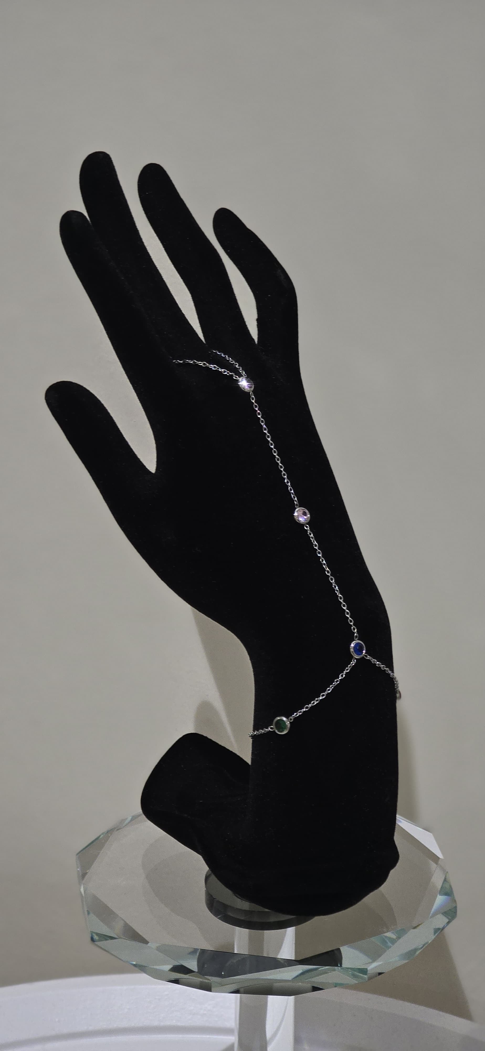 سوار Hand Chain فضي أنيق مرصّع بأحجار ملونة لامعة (أزرق، أخضر، بنفسجي)، مستوحى من ألوان السماء والنجوم.